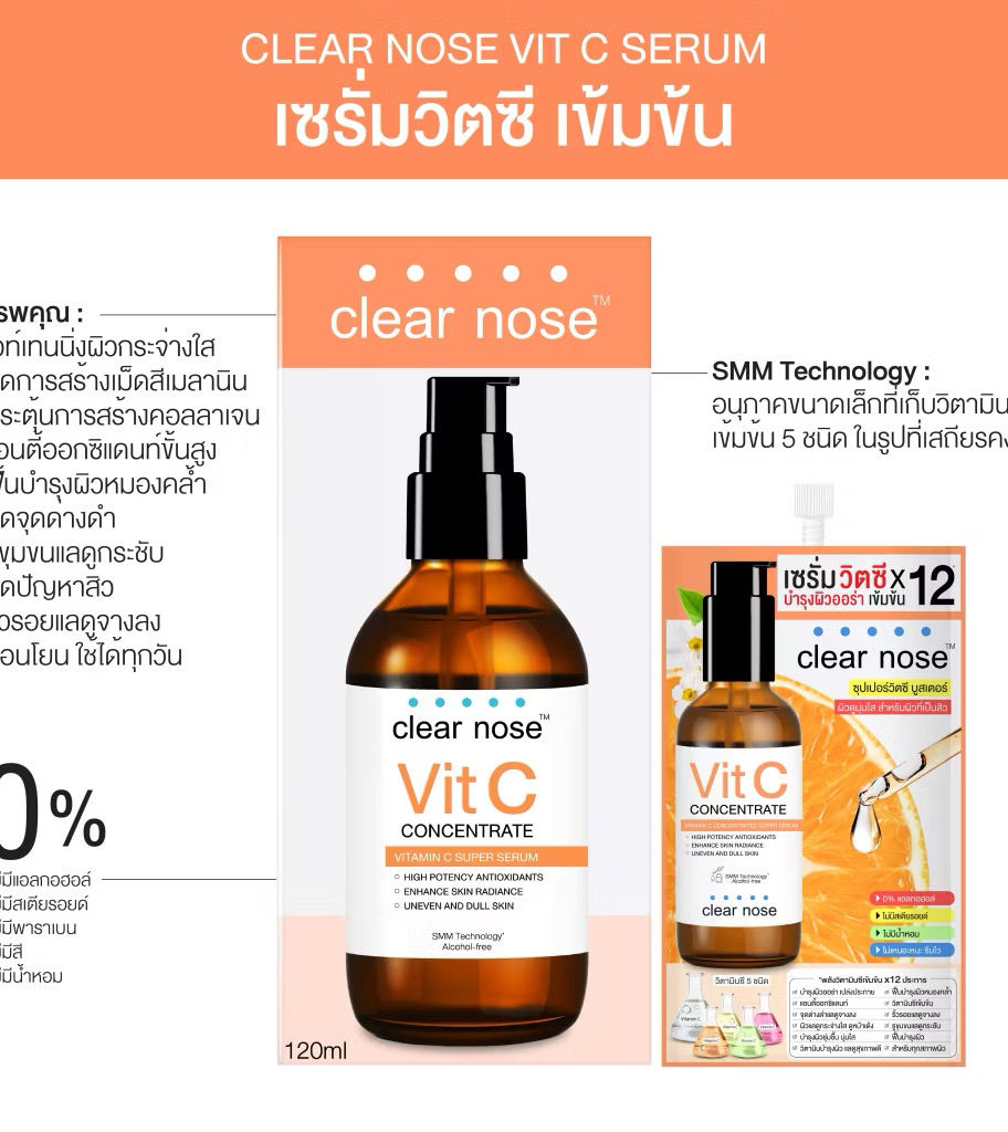 ฟื้นบำรุงผิวหมองคล้ำให้กลับมาดูสดใส เปล่งประกายด้วย Clear Nose Vit C Concentrate Super Serum ผลิตภัณฑ์บำรุงผิวหน้าสูตรเข้มข้น เนื้อเซรั่มบางเบา ซึมซาบไว ไม่เหนียวเหนอะหนะ ด้วยอนุภาคขนาดเล็กจากเทคโนโลยี SMM (Smart Microsphere Technology) ช่วยเก็บกักวิตามินซีเข้มข้น 5 ชนิดให้คงประสิทธิภาพสูงและเสถียรที่สุด เพื่อการบำรุงที่ล้ำลึก