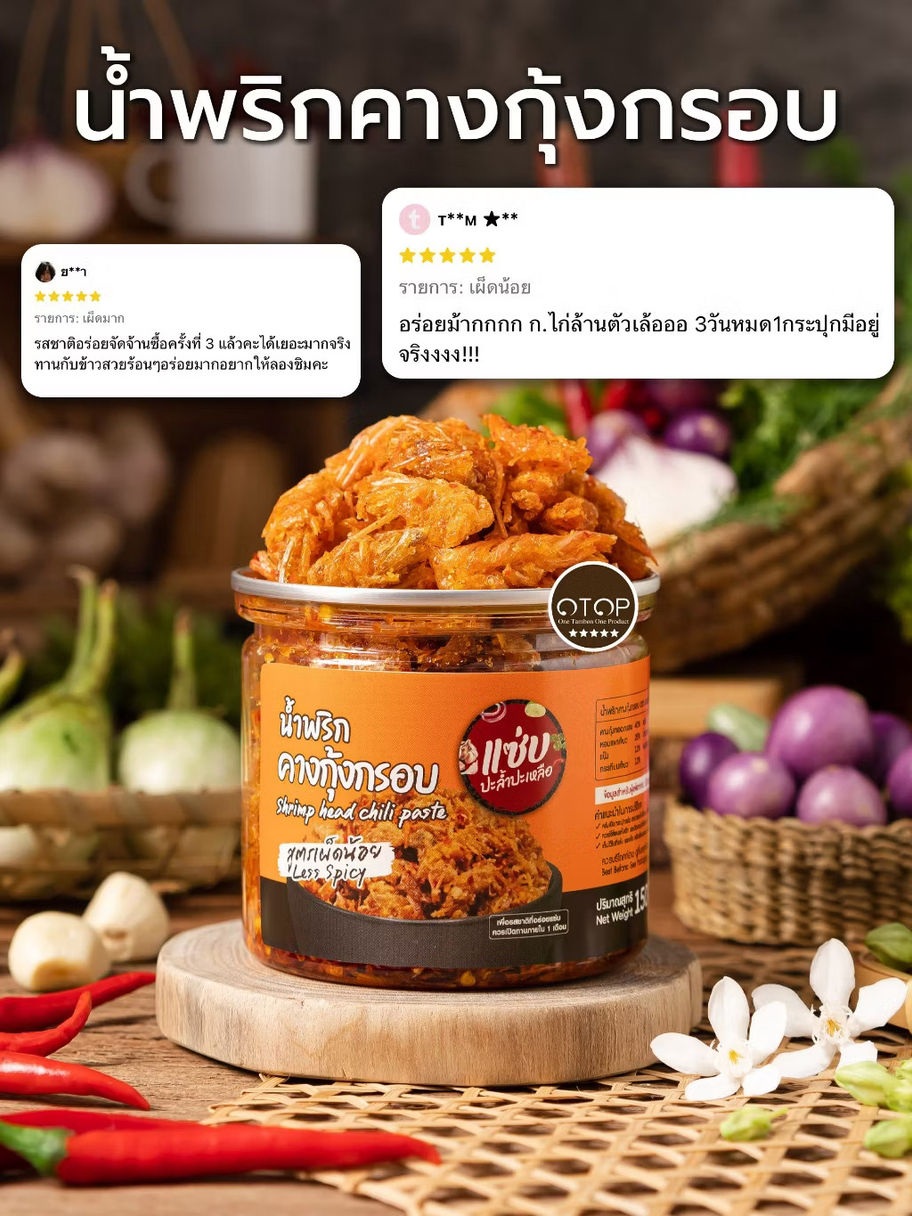 เปลี่ยนการทานน้ำพริกให้เป็นเรื่องสนุกและได้ประโยชน์กับ "น้ำพริกคางกุ้งกรอบ" แบรนด์แซ่บปะล้ำปะเหลือ คัดสรรคางกุ้ง (ส่วนใต้หัวกุ้ง) ชิ้นโต นำมาทอดจนกรอบเหลืองฟู ปรุงรสด้วยเครื่องน้ำพริกสูตรเด็ด รสชาติเข้มข้น หอมกลิ่นกุ้งคั่วและสมุนไพร จุดเด่นคือความกรอบที่ไม่เหมือนใคร เคี้ยวมันส์ และที่สำคัญคือ "แคลเซียมสูง" จากเปลือกกุ้งธรรมชาติ อร่อยได้แบบไม่รู้สึกผิด มีให้เลือก 2 ระดับความเผ็ด