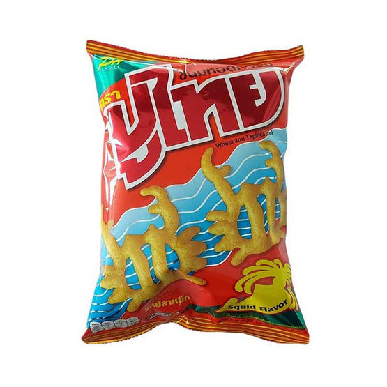 ขนมกรอบแผ่นบาง กลิ่นปลาหมึกย่างหอมเตะจมูก รสเค็มมันลงตัว มีเอกลักษณ์เฉพาะตัวแบบ snack ไทยดั้งเดิม ที่กินเมื่อไหร่ก็คิดถึงบรรยากาศริมทะเล